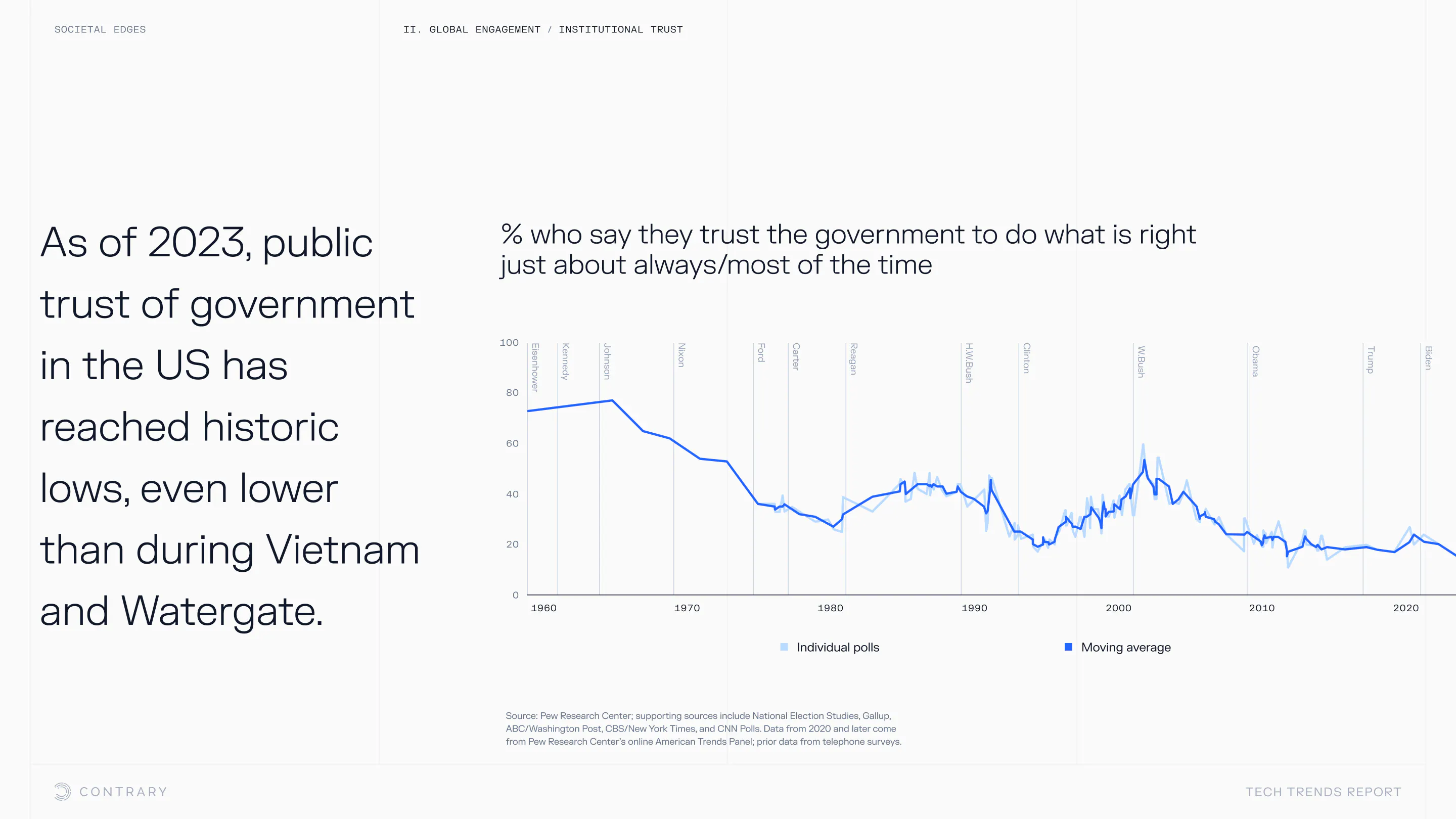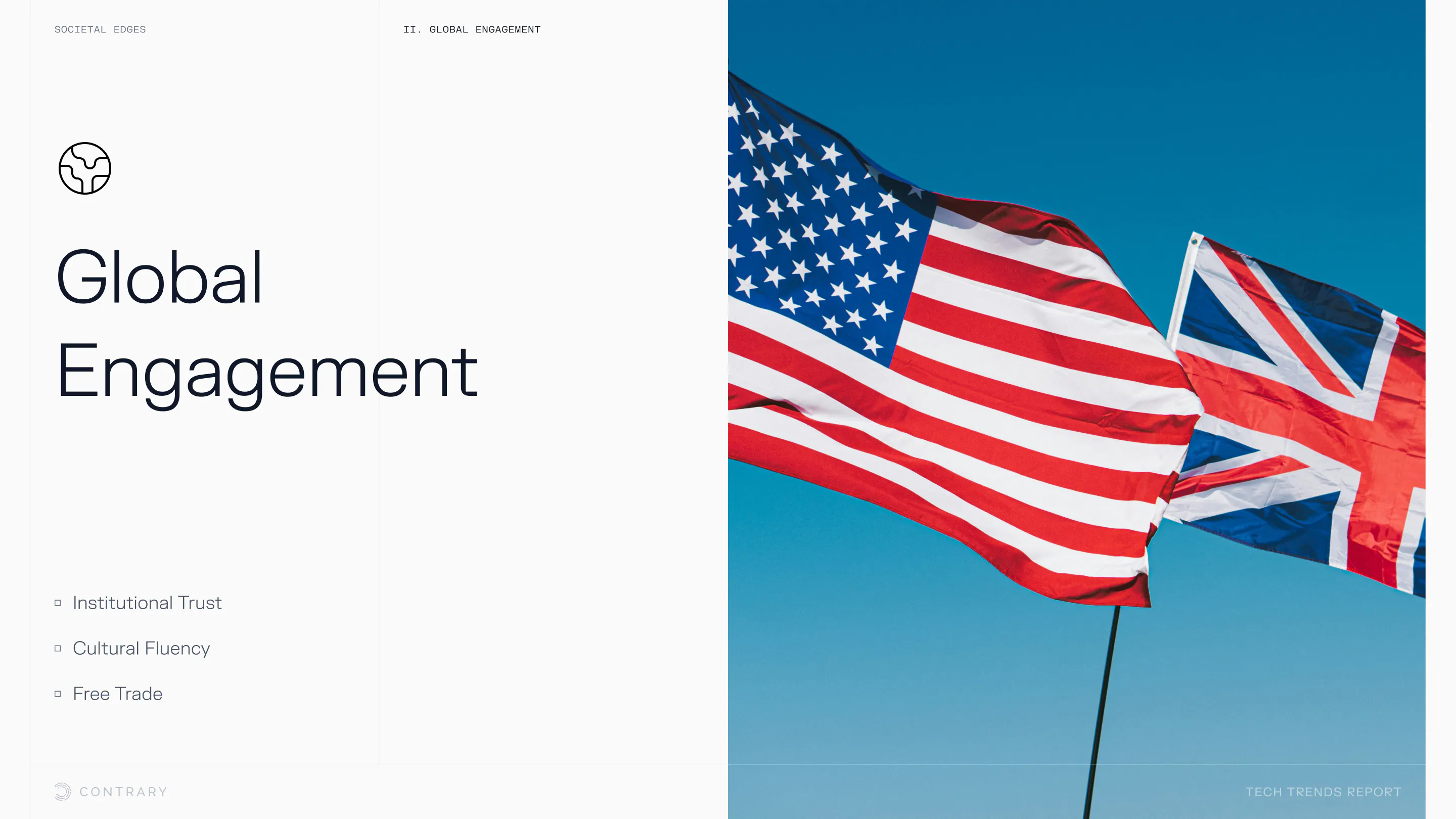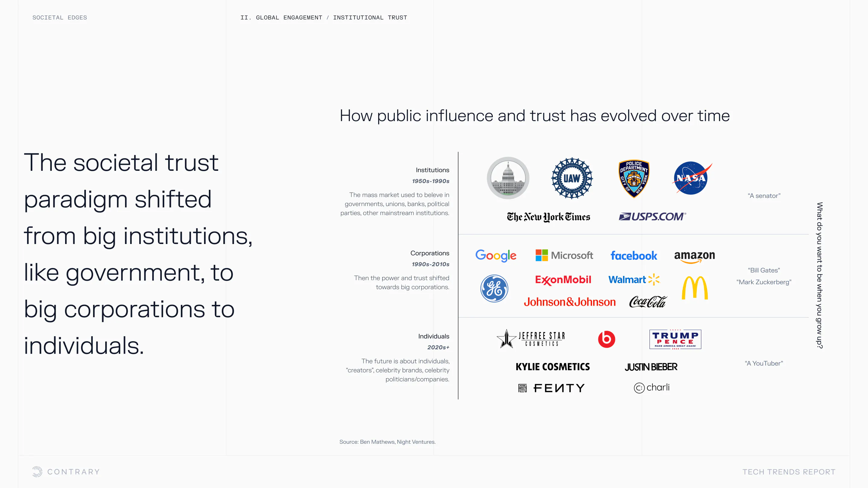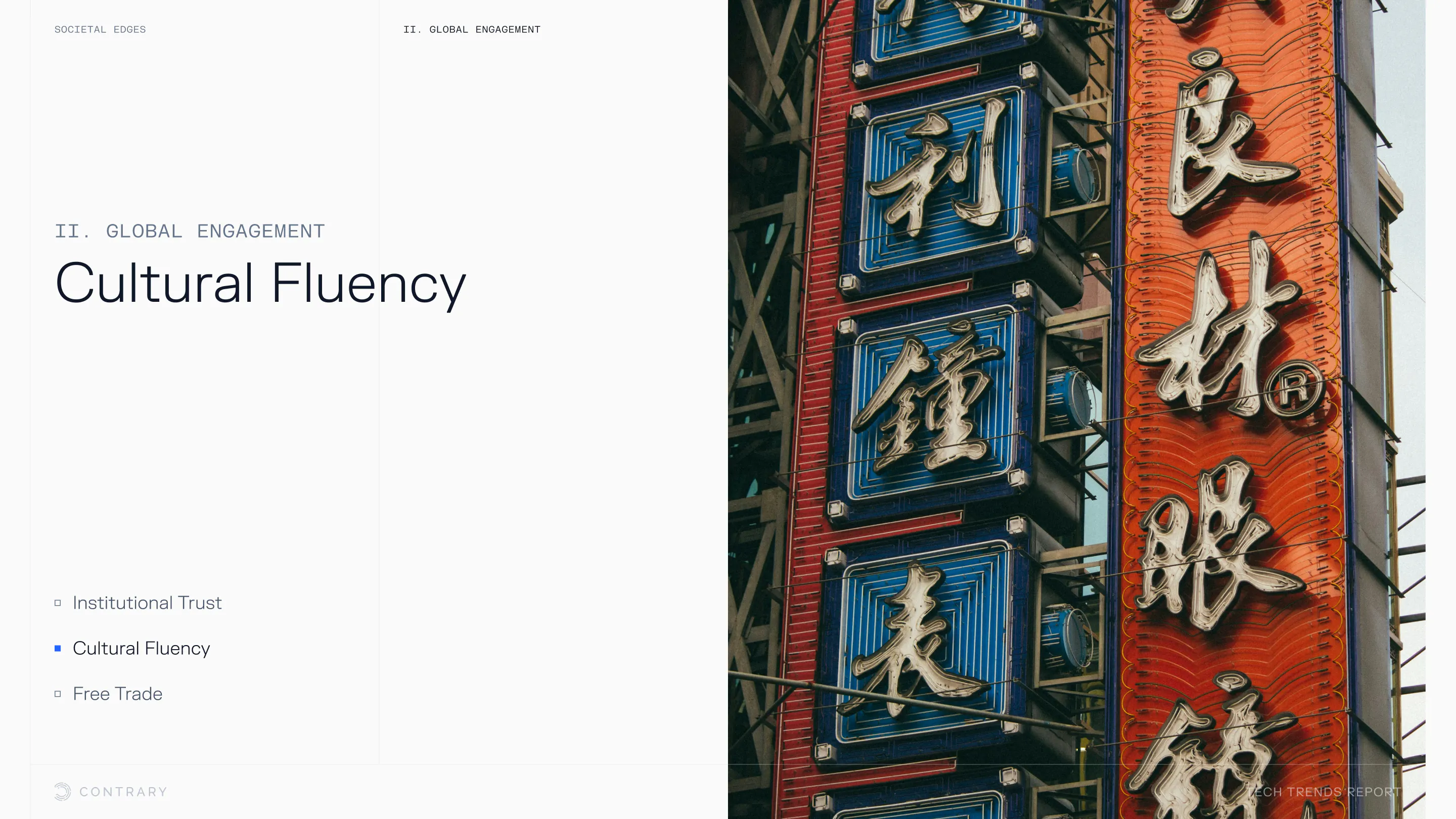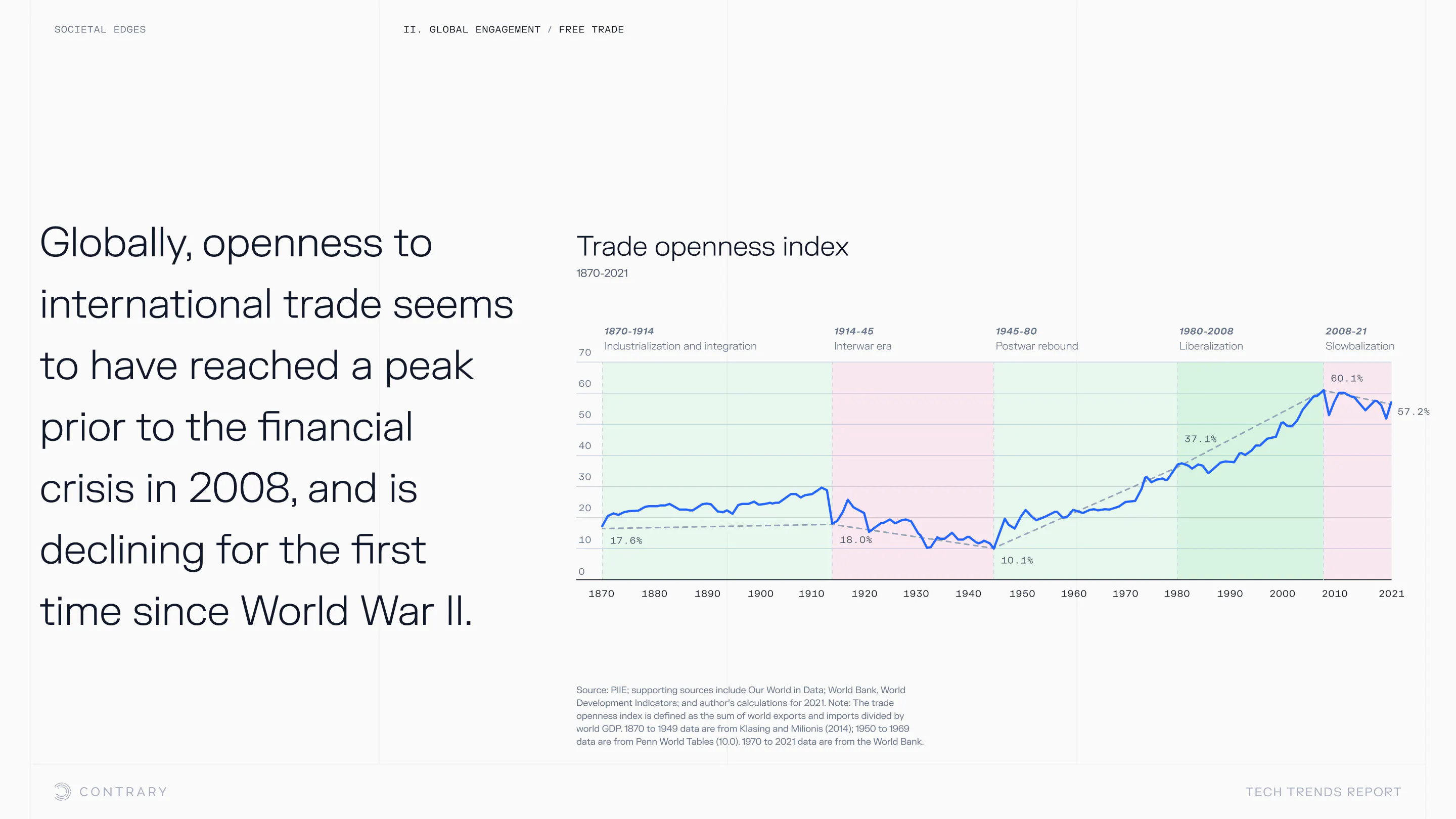 Institutional trust is falling and globalization is facing a global backlash, with global openness to trade declining for the first time since WWII. The cutting edge is leaning into localization and microcultures.